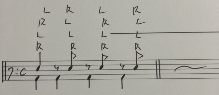 画像にある形を練習していきましょう。右手のみと左手のみ、そして交互に叩いていきます。もちろんメトロノームとバスドラに相当する「足」を忘れずに。特に足を付けると付けないとでは練習の効率が違ってきます。色々な速さで叩けるよう頑張っていきましょう!
